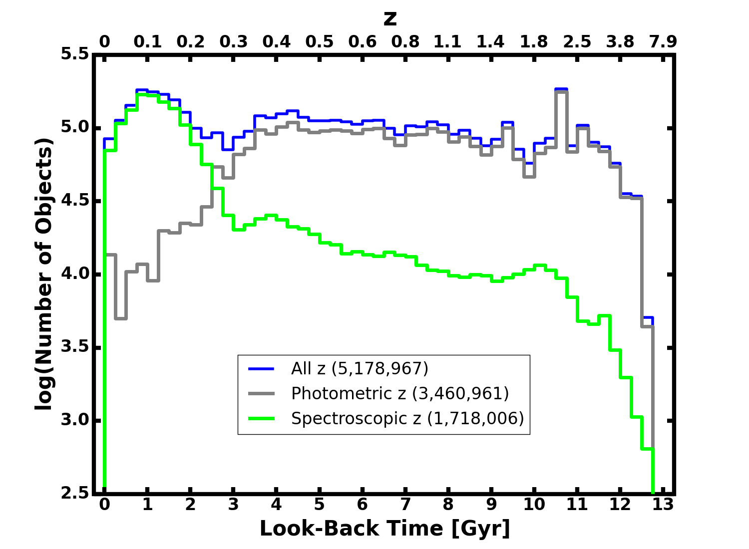 Redshift DistributionThe spectroscopic and photometric redshift (look-back time) distributions of NED objects as of 2015 April.